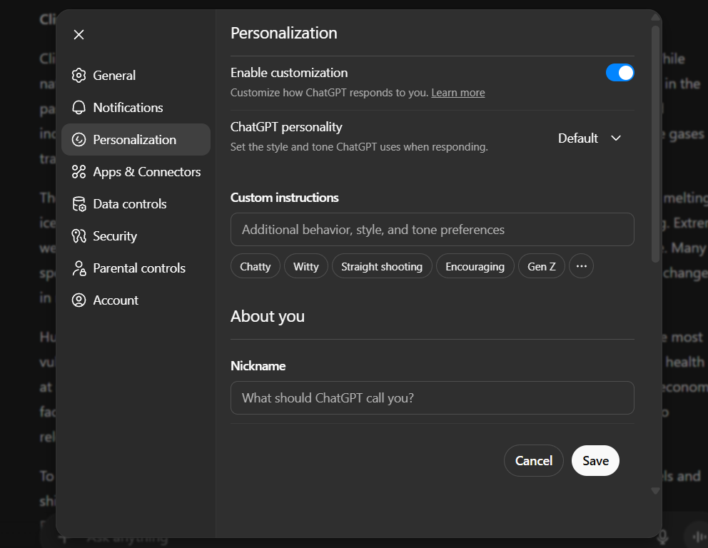 Custom instructions are a simple way to make ChatGPT align with your personal writing style. Whether you’re drafting blogs, emails, or reports, setting these preferences helps produce consistent, human-like content without repeating your style request in every chat.