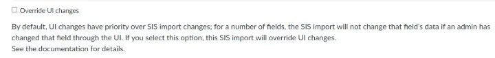 Certain changes made in the user interface are not overwritten by future SIS imports and are specified as being sticky. All sticky fields are identified in this document. You can override these fields by setting override_sis_stickiness in the API or checking the Override UI changes checkbox in the SIS Import page.