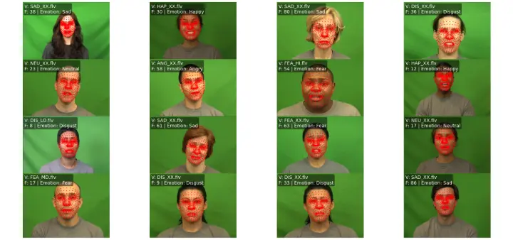 - The normalized landmark coordinates were overlaid on corresponding video frames, with emotions annotated for each sample.
