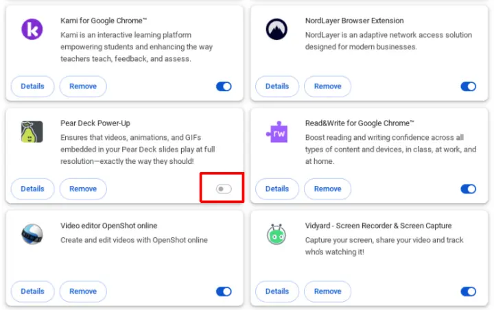 ● Extensions like Pear Deck showed compatibility issues when Manifest V2 was disabled.