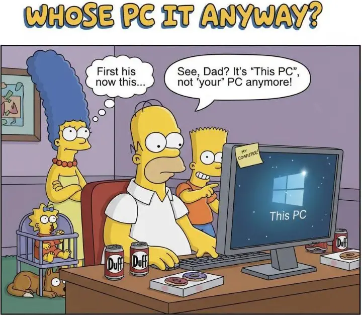 Microsoft framed the change as “modernizing the interface”. And sure “This PC” aligns nicely with their new aesthetic of cloud accounts, shared devices and AI assistants who think they’re your manager.