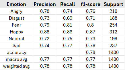 - The final test set accuracy and F1-scores indicate the model’s ability to generalize emotion classification from landmark data.